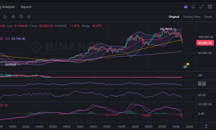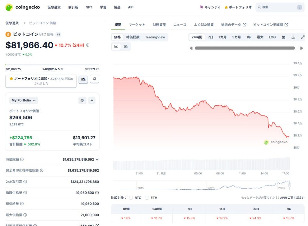 世界最大の暗号資産である Bitcoin(BTC)は、10月上旬に史上最高値12万6,200ドルを更新したものの、その直後から急速に調整局面に入っており、11月21日時点ではおおよそ8万2,000ドル(約-35%)付近にまで下落してきたという状況です。